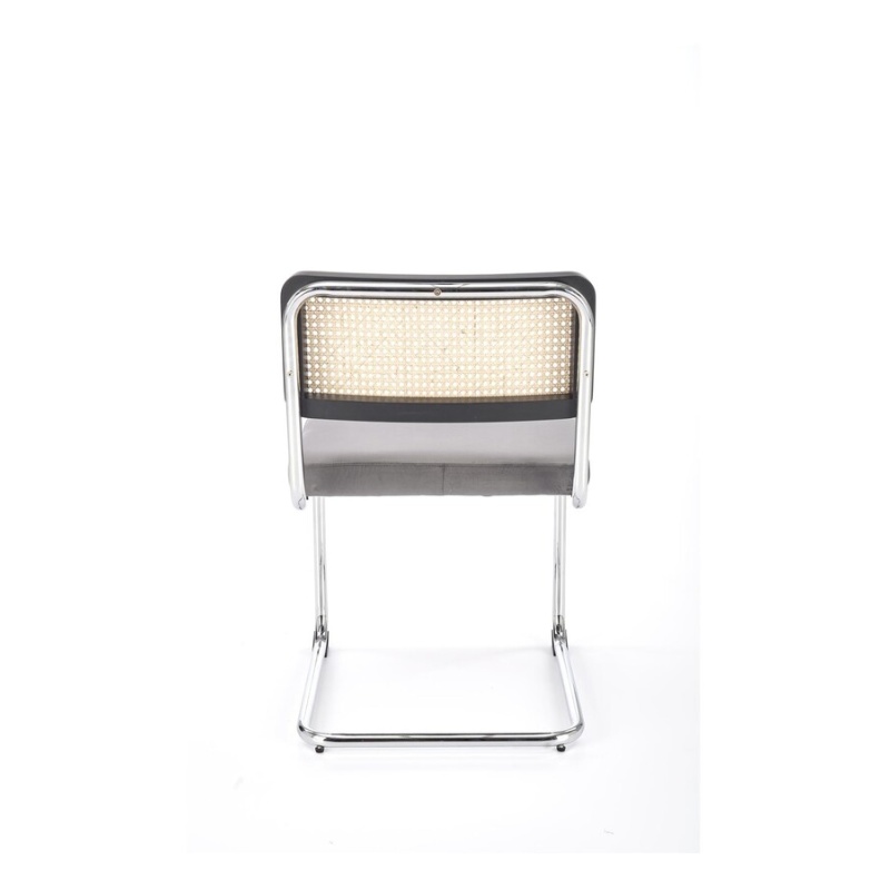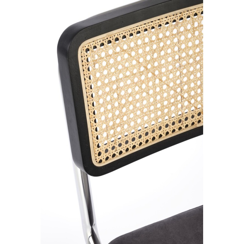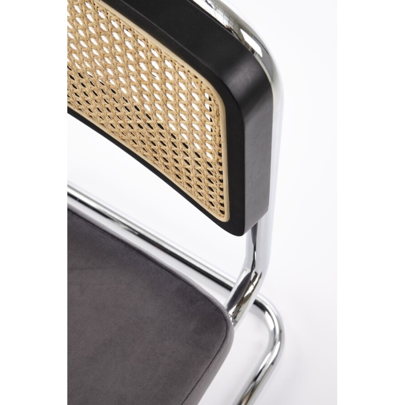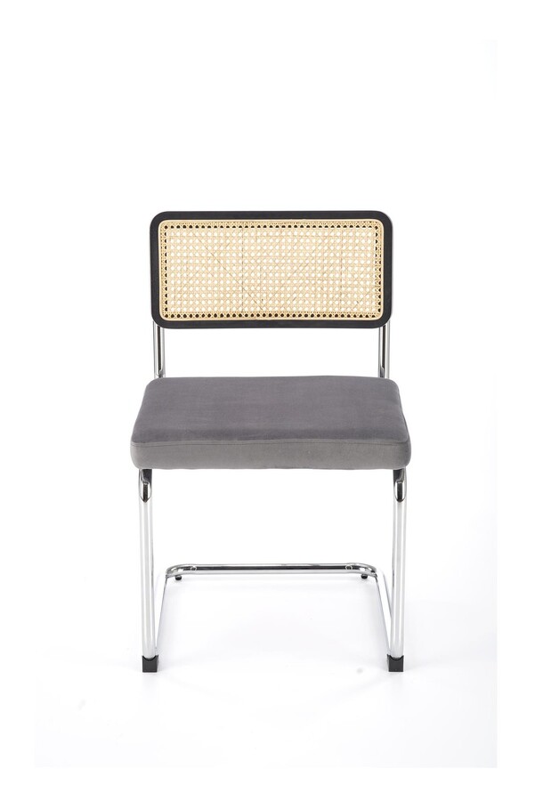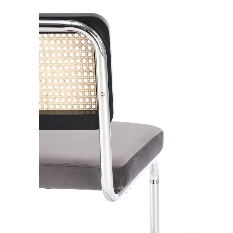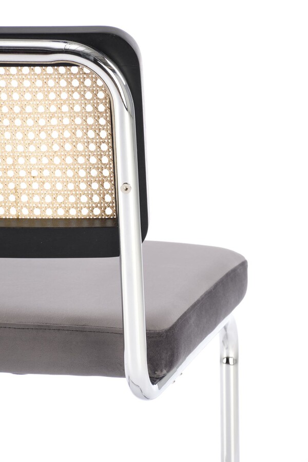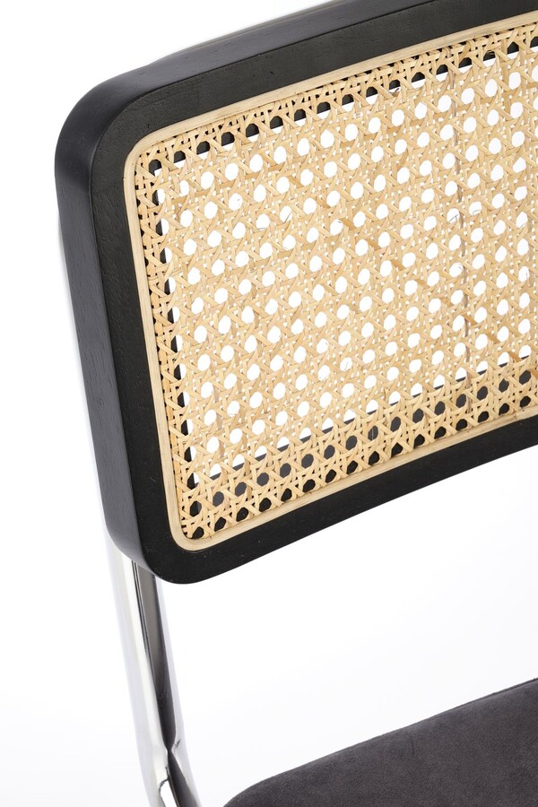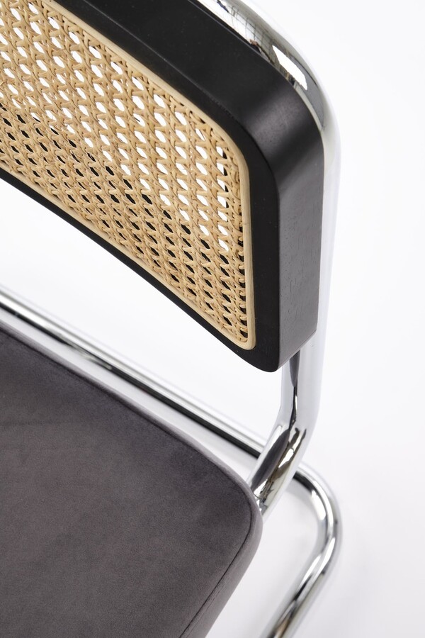 Столът, който съчетава модерност и традиция, е отлично предложение за хора, които ценят оригиналните решения. Плъзгачите от хромирана стомана в сребрист цвят са солидна основа, върху която е поставена правоъгълна седалка. Тапицирана с велурена дамаска в сив цвят, седалката придава елегантност и комфорт на стола. Интересен акцент на е черната облегалка на стола, която има формата на рамка от масивно каучуково дърво. Рамката е изпълнена с ажурна плетка изработен от синтетичен ратан в естествен цвят, което придава на мебелите уникален характер.Столът пасва на много стилове на аранжиране, както в дома, така и в търговски помещения, като хотели или ресторанти.Избирайки този стол, можете да сте сигурни, че ще внесете оригинален акцент в интериора, който ще привлече вниманието и ще предизвика интерес е идеален избор за хора, които ценят минимализма и модерния стил и в същото време желаят да внесат елементи от традицията в своя интериор. Елегантният му дизайн със сигурност ще привлече вниманието и ще добави характер към всяка стая.