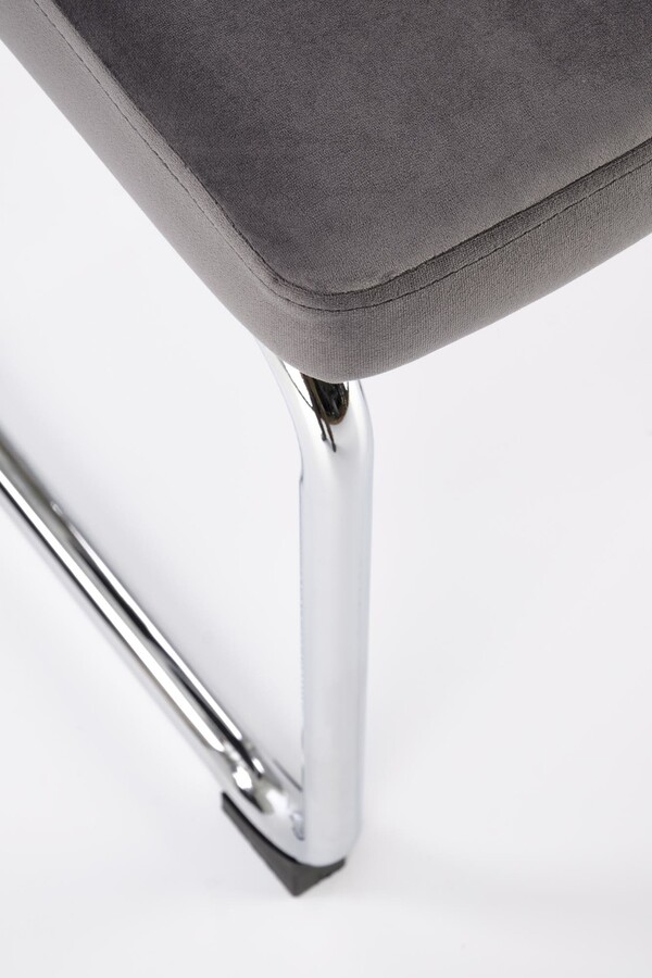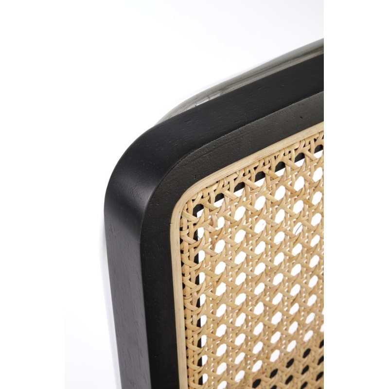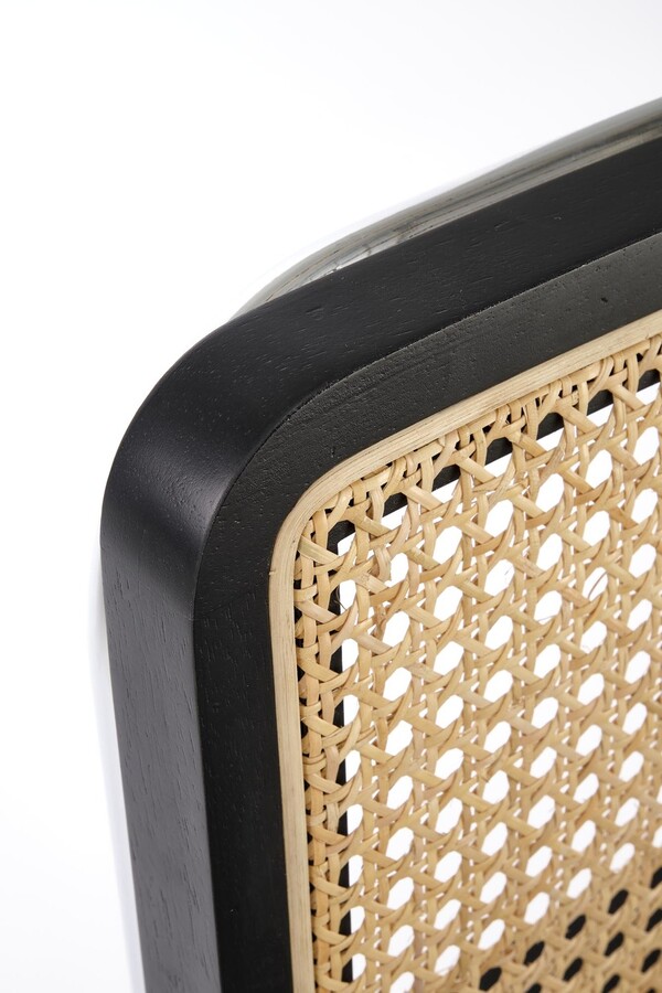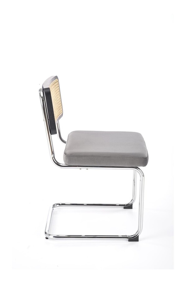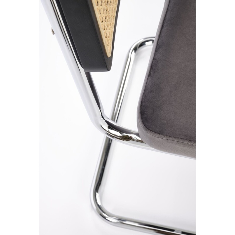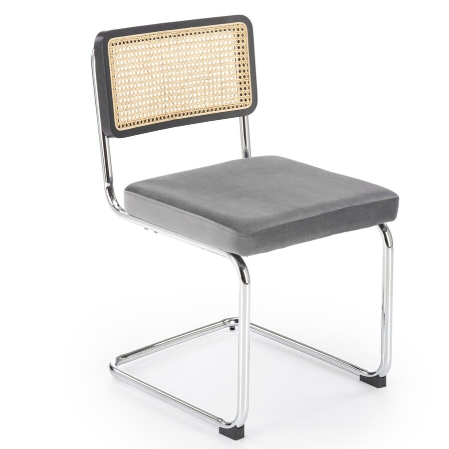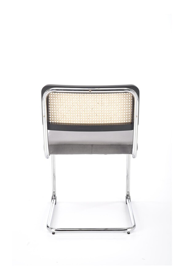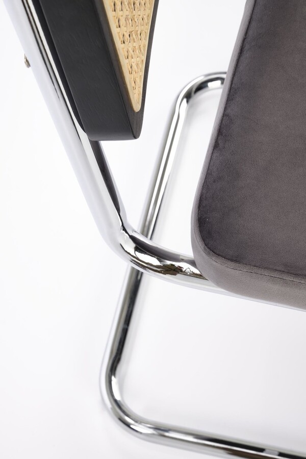 Столът, който съчетава модерност и традиция, е отлично предложение за хора, които ценят оригиналните решения. Плъзгачите от хромирана стомана в сребрист цвят са солидна основа, върху която е поставена правоъгълна седалка. Тапицирана с велурена дамаска в сив цвят, седалката придава елегантност и комфорт на стола. Интересен акцент на е черната облегалка на стола, която има формата на рамка от масивно каучуково дърво. Рамката е изпълнена с ажурна плетка изработен от синтетичен ратан в естествен цвят, което придава на мебелите уникален характер.Столът пасва на много стилове на аранжиране, както в дома, така и в търговски помещения, като хотели или ресторанти.Избирайки този стол, можете да сте сигурни, че ще внесете оригинален акцент в интериора, който ще привлече вниманието и ще предизвика интерес е идеален избор за хора, които ценят минимализма и модерния стил и в същото време желаят да внесат елементи от традицията в своя интериор. Елегантният му дизайн със сигурност ще привлече вниманието и ще добави характер към всяка стая.