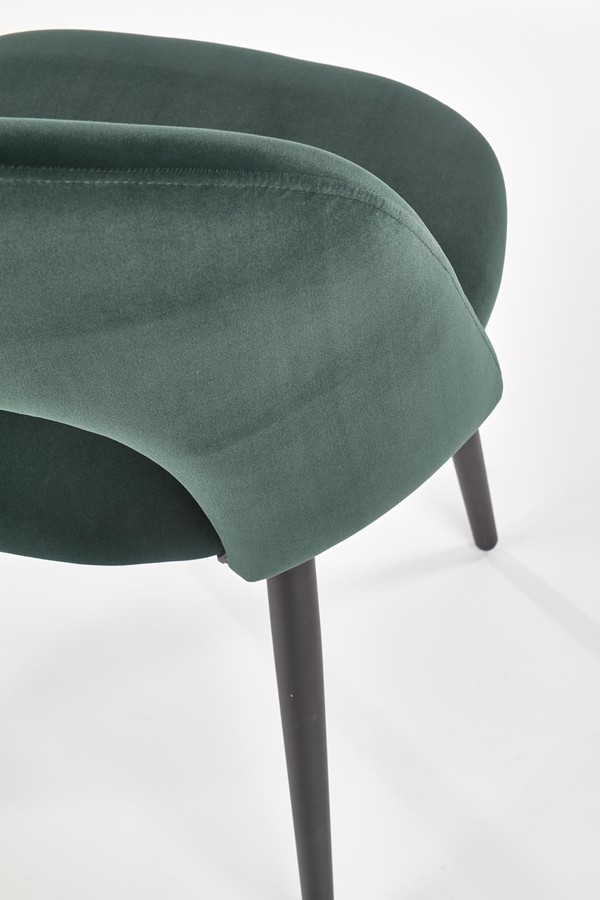 Моделът е стол, който се отличава с необичаен декор на фона на продуктите, налични в магазина. Половинният дизайн на профилираната облегалка е отделен от седалката с декоративно изрязване -OUT. Столът без подлакътници е тапициран с качествена кадифена тъкан в тъмнозелен нюанс. Материалът, използван в производствения процес, е приятен на пипане, изглежда първоначално и в същото време е лесно да се поддържа чист. Столът, завършен в модерен стил, ще подчертае декорирания интериор, наред с други в бляскав стил. Модела се поставя върху стабилна рамка, която е завършена с четири крака, изработени от прахообразна стомана.