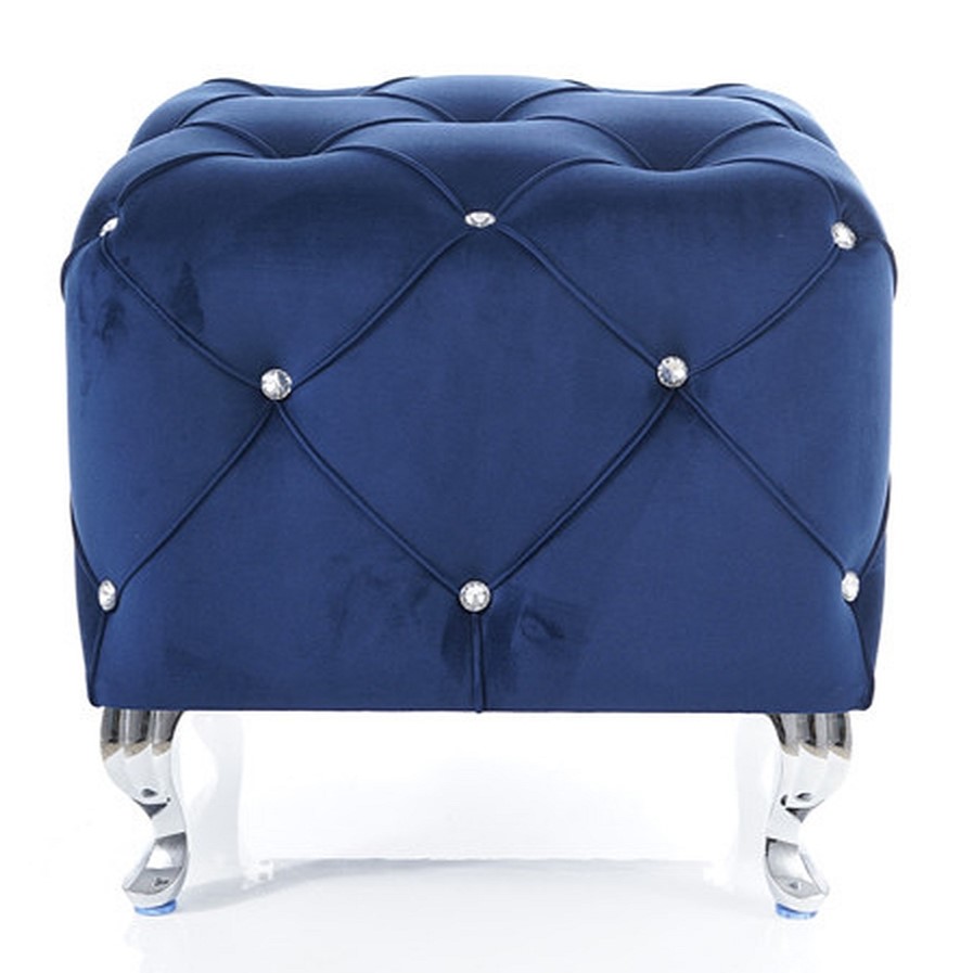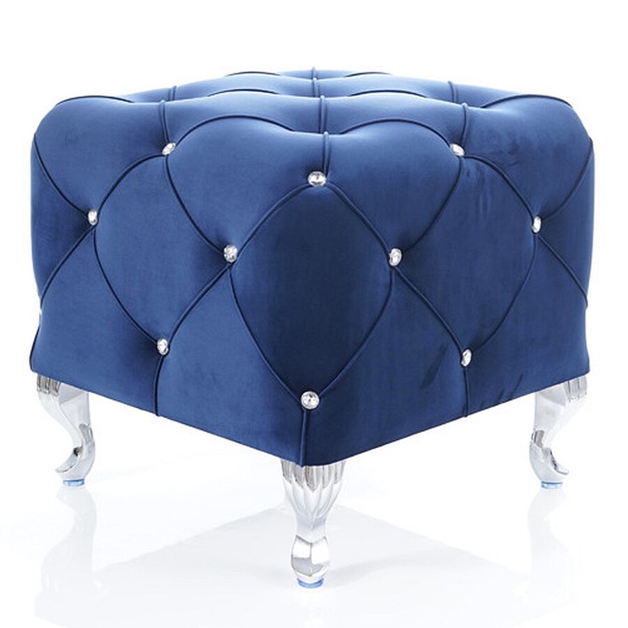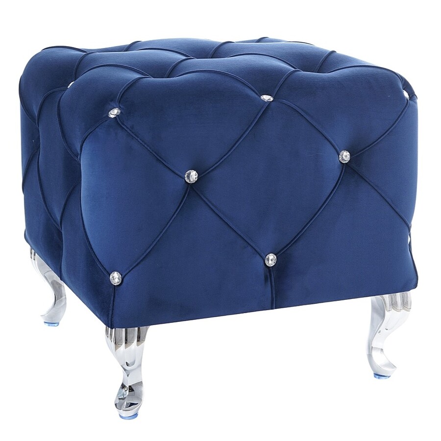 Табуретка – създаден според тенденциите в стила на блясък, поради което уникалната му естетика заслужава внимание. Лесно ще се съчетае с богато декориран интериор, включително предимно в стила на блясъка. Мебелите могат да се използват като индивидуална седалка или като крак за други празнични мебели и ще бъдат перфектни на места като домашен салон, спалня или зала. Той може да се използва успешно в стилизирани офис и хотелски интериори. Основата на мебелите е изработена от сребърен метал, а четири стилизирани крака напускат блока. Блокът от мебели е покрит с тъмносиня тапицерия, която е много подобна на кадифе. В допълнение, характерът на мебелите се подчертава от ватиран модел и бутони, оформени от кристал, които се намират във всяка депресия. Мебелите се предлагат в различни размери и в няколко цветови варианта. Продуктът се доставя на клиента в елементи и изисква собствен монтаж.