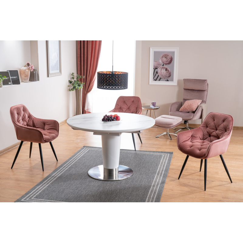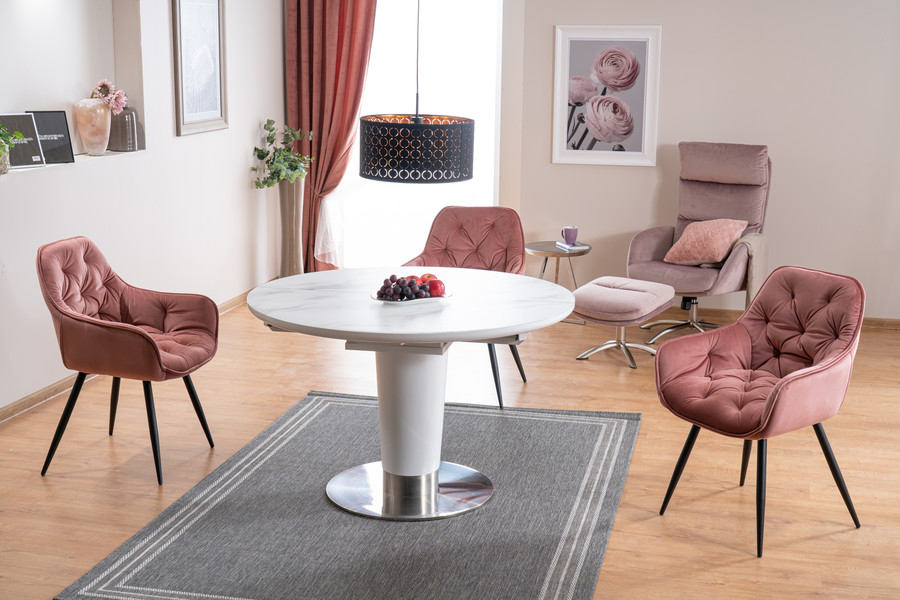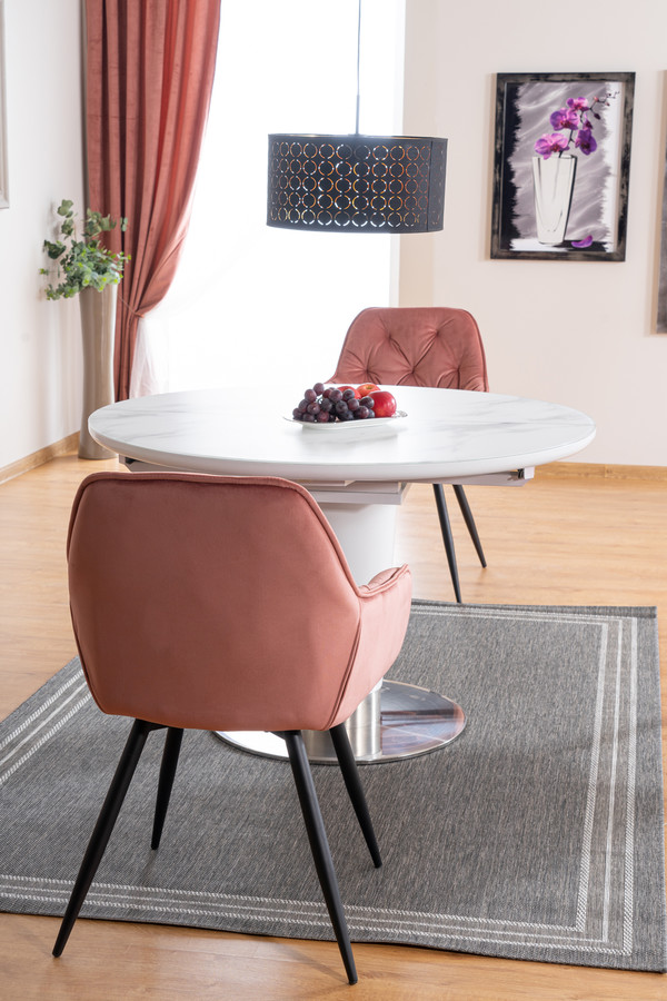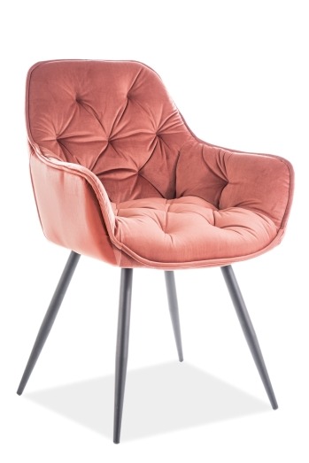 Стол – ергономична структура с леко заоблени ръбове. Столът от средната височина с профилирана облегалка е свързан с практически подлакътници, благодарение на която можете лесно да седнете на него. Декоративният ватиран стол е тапициран с кадифена тъкан в розов нюанс. Материята, използвана в производствения процес, е изключително естетически приятна и е мека на пипане. Споменатата по -горе квилинг създава мебелите впечатление за пухкави, което допринася за увеличаване на впечатлението за комфорт на употреба. Мебелите, които осигуряват дори дълги места за сядане, се поставят върху прави метални крака в черна постелка. Модерен стол с подлакътници ще работи в кухнята, трапезарията и дори хол, към който ще въведе аспект на високата естетика, както и уютен герой, благоприятен за почивка.