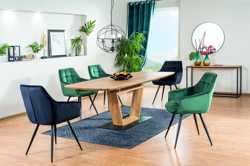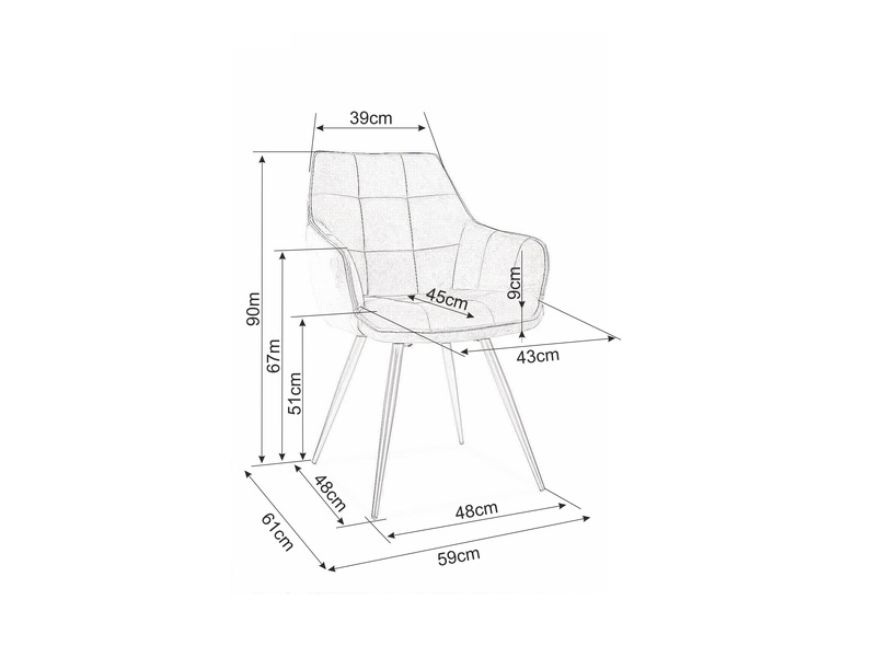 Стол – модерно проектирано парче мебели, което работи перфектно при ежедневна и интензивна употреба. В допълнение, си струва да обърнете внимание на естетиката на проекта, благодарение на която председателят също бързо ще се превърне в важен декоративен елемент в подредбата. Съвременният характер на мебелите се вписва добре в съвременния интериор, включително елегантни бляскави аранжировки. Мебелите са създадени за използването му в домашен салон, в спалня или трапезария, където може да бъде допълнение към масата или да представлява индивидуална празнична седалка. Естетиката на мебелите също позволява да се използва в търговски пространства. Основата на мебелите е изработена от метал, която е боядисана в черно. Четири, прави крака напускат рамката – върху тях е вградена тапицирана форма, която включва седалка, облегалка и подлакътници. Тези елементи са завършени с тъмносиня тъкан, напомняща кадифе. На повърхността му беше бродиран ватиран кариран модел. Мебелите също са профилирани, благодарение на които улесняват употребата му. Столът се предлага в няколко цветови варианта.