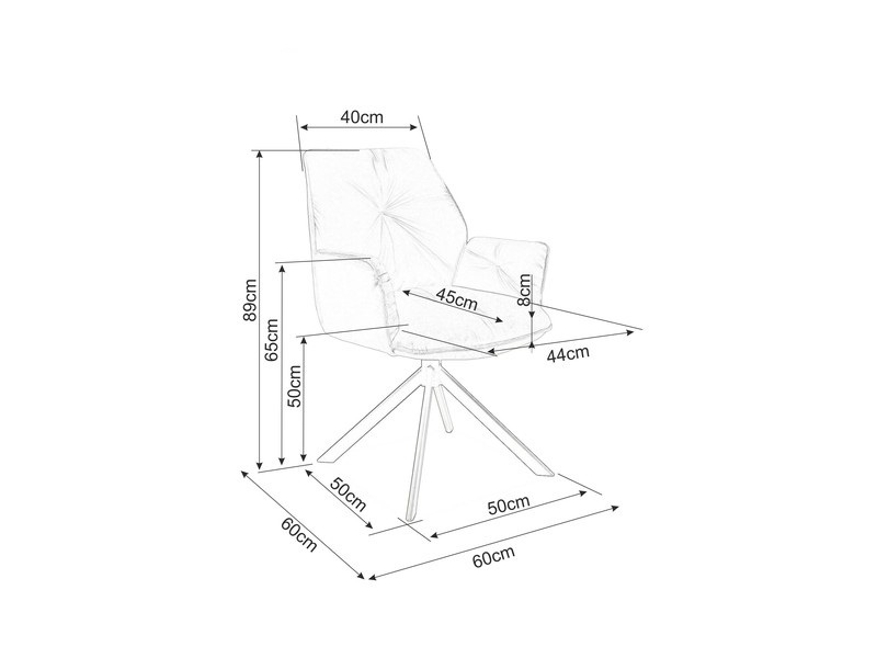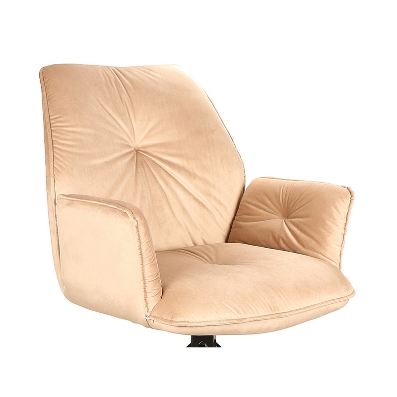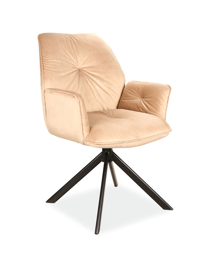 Стол – Кадифеният стол със сигурност ще намери използването си в пространството на хола, трапезарията или офиса. Цялата седалка е подрязана с кадифена тъкан в нюанс на бежово, а на всеки елемент има фин квилинг. И гърбът, и подлакътниците са леко огънати, което влияе положително на дизайна на мебелите и комфорта на седене. Цялото е вградено върху кръстосана метална рамка. Кадифеният стол също има функция за въртене на 180 градуса с автоматично връщане.