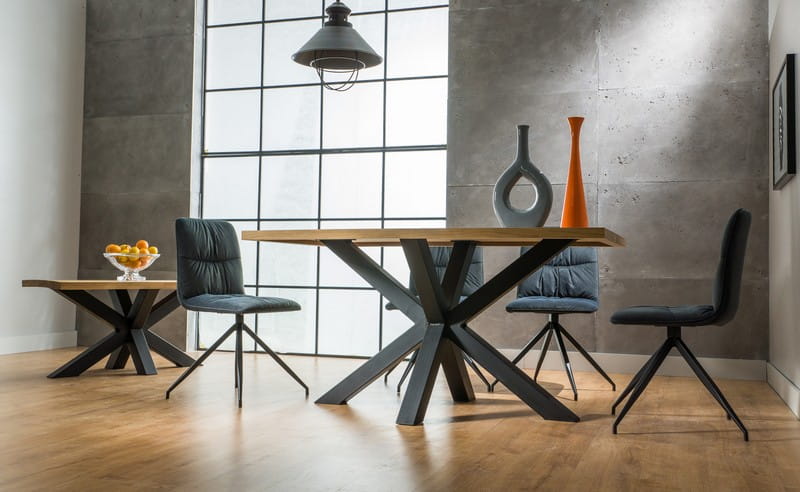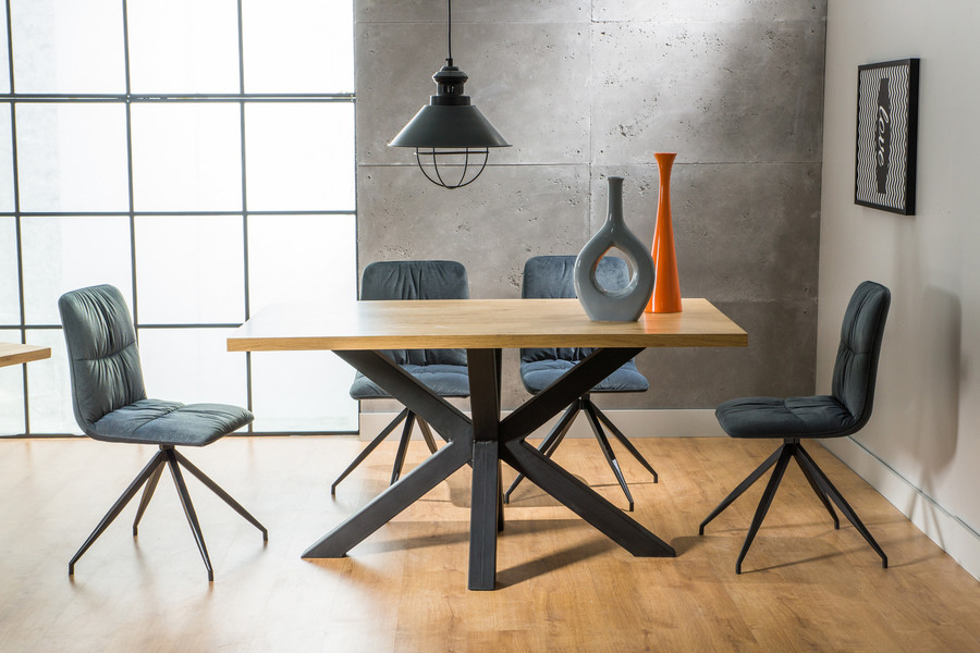 Трапезна маса – маса е практична мебел, която може да се побере във всякакви условия в стаята. Мебелите впечатляват с неговия неочевиден дизайн и сложна комбинация от материали. Това е ефективно парче мебели, което ще работи както в прост интериор, така и в такива с луксозен или модерен характер. Мебелите се препоръчват за всички любители на оригиналните решения. Горната маса е направена от естествен фурнир и дървена рамка. Масата се предлага в два размера.
