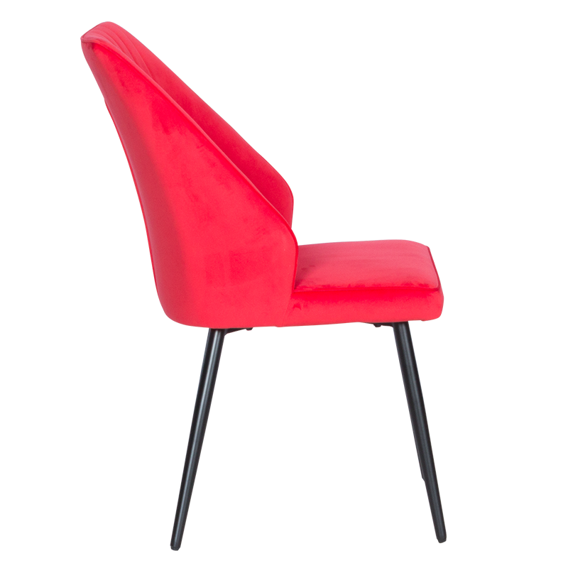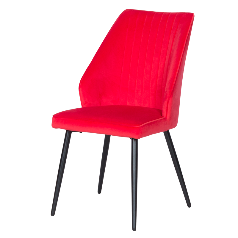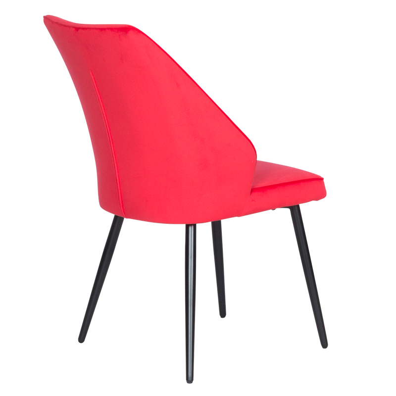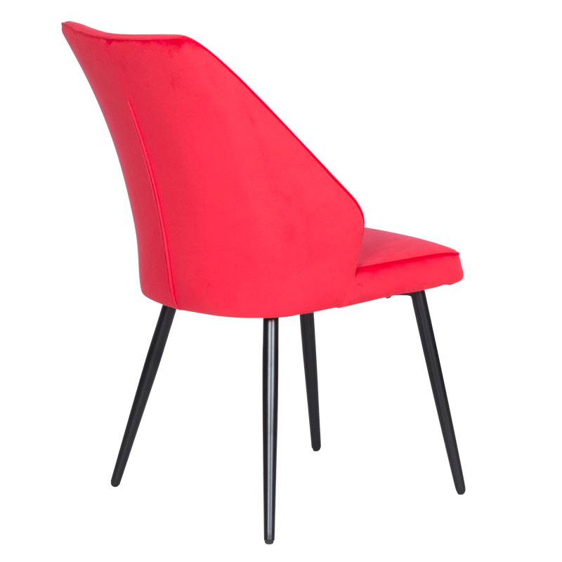 Столът е внимателно проектиран, за да предостави максимален комфорт и издръжливост. Меката тапицерия от плюшено или велурено усещане добавя допълнителен лукс, докато ергономичната форма на облегалката поддържа тялото и намалява умората при продължителна употреба. Здравата метална база със стабилни крака осигурява надеждност и сигурност, като същевременно предоставя елегантен контраст с наситения червен цвят.
