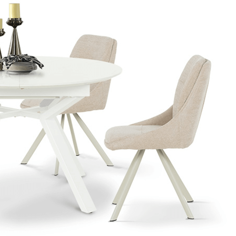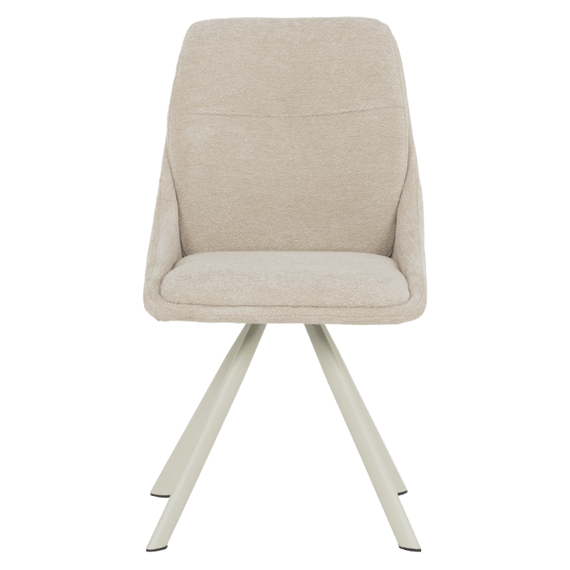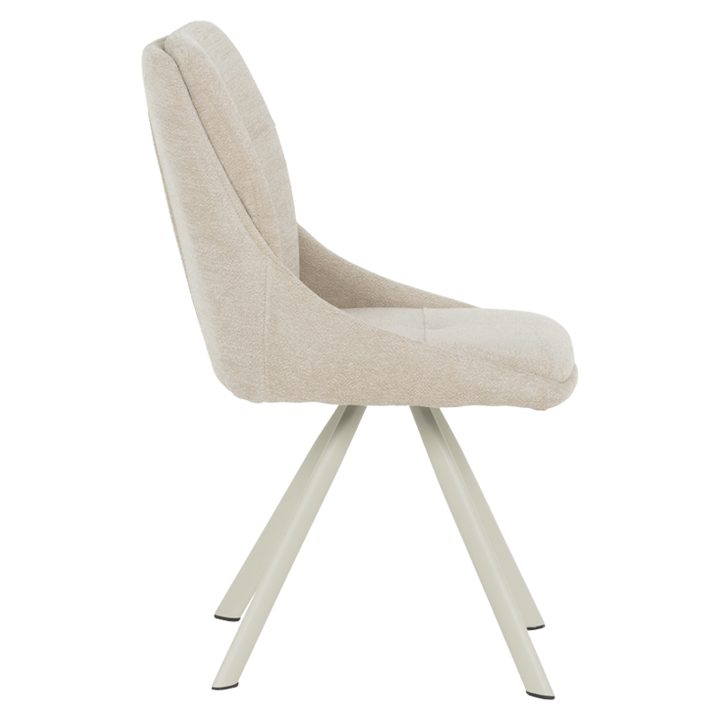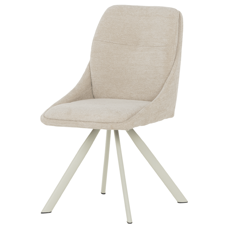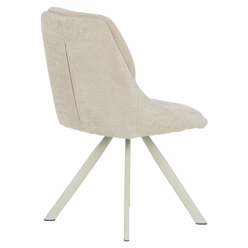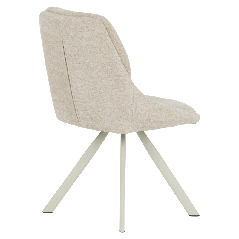 Този елегантен трапезен стол съчетава модерен дизайн с изключителен комфорт, идеален за всяка съвременна трапезария. Изработен с внимание към детайла, столът предлага изчистени линии и стилна визия, която лесно се вписва в различни интериорни стилове. Седалката и облегалката са облечени в мек, кремав текстил, който придава усещане за уют и топлина. Материалът е не само приятен на допир, но и издръжлив, осигурявайки дълготрайна употреба.