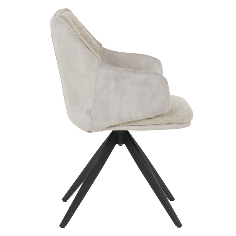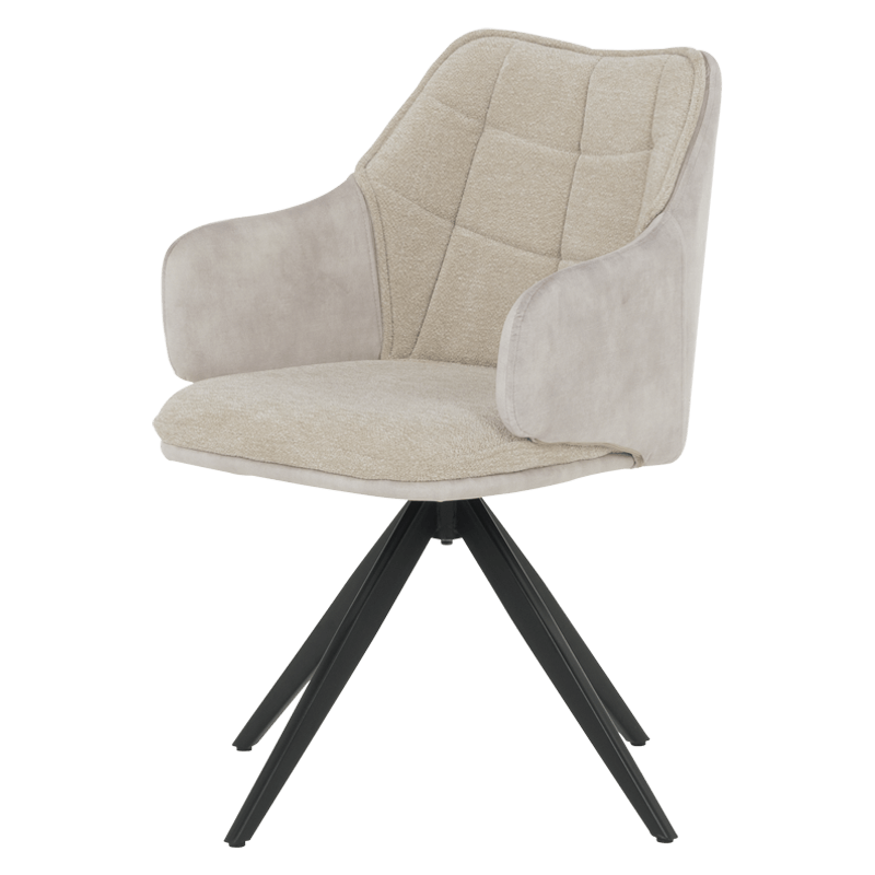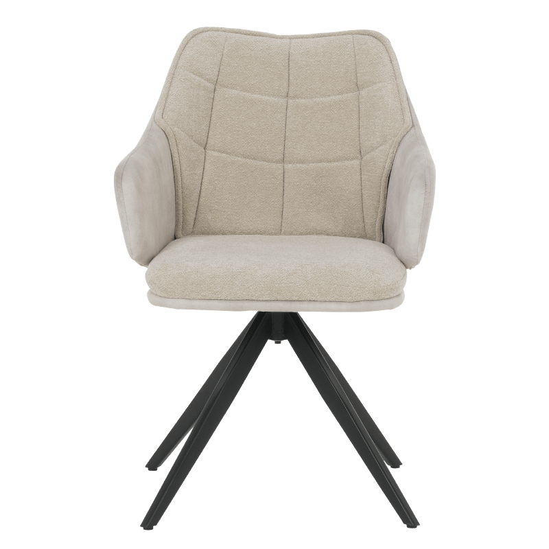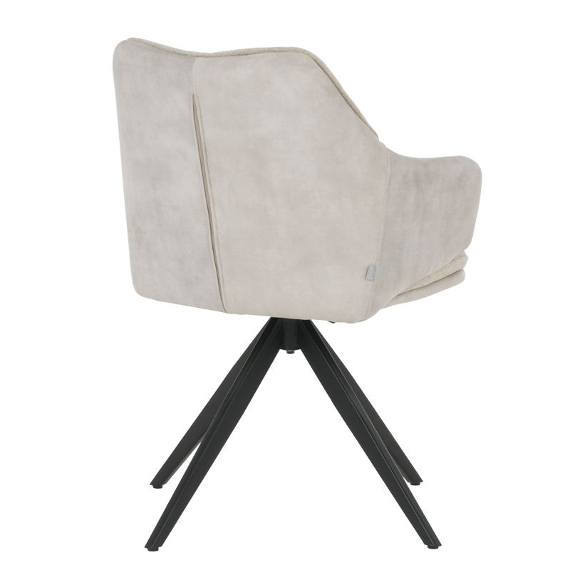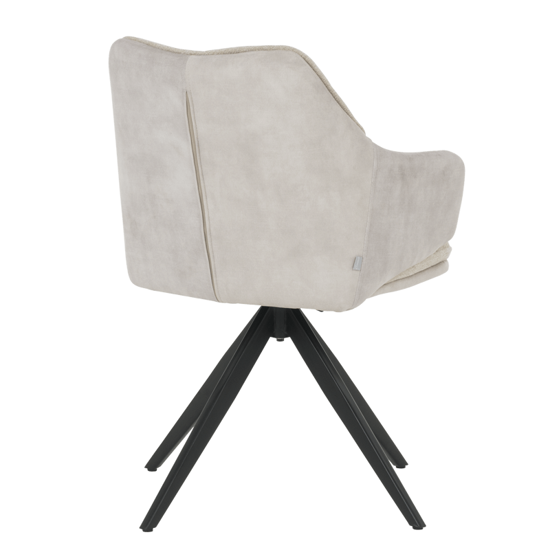 Трапезният стол предлага елегантен дизайн и стабилна основа от праховобоядисан метал. Облегалката и седалката са изработени от приятна на допир дамаска с високо качество. Моделът разполага с удобни подлакътници, които осигуряват необходимия комфорт за ръцете, както и функция за 360° въртене на седалката. Подробна информация за размерите и характеристиките му може да бъде намерена в таблицата в секция „Техническа информация“.