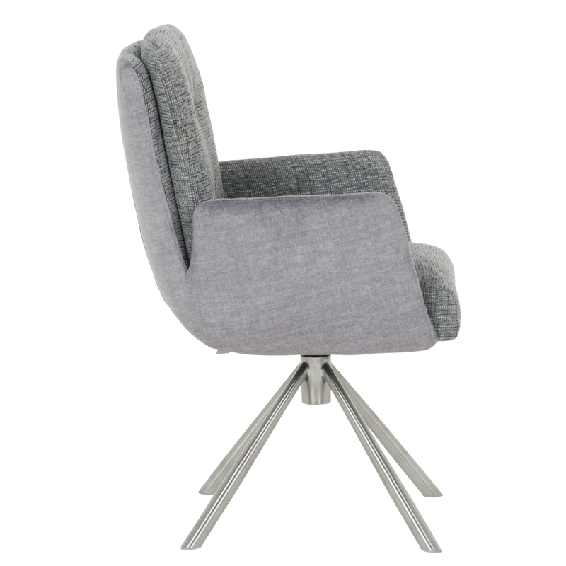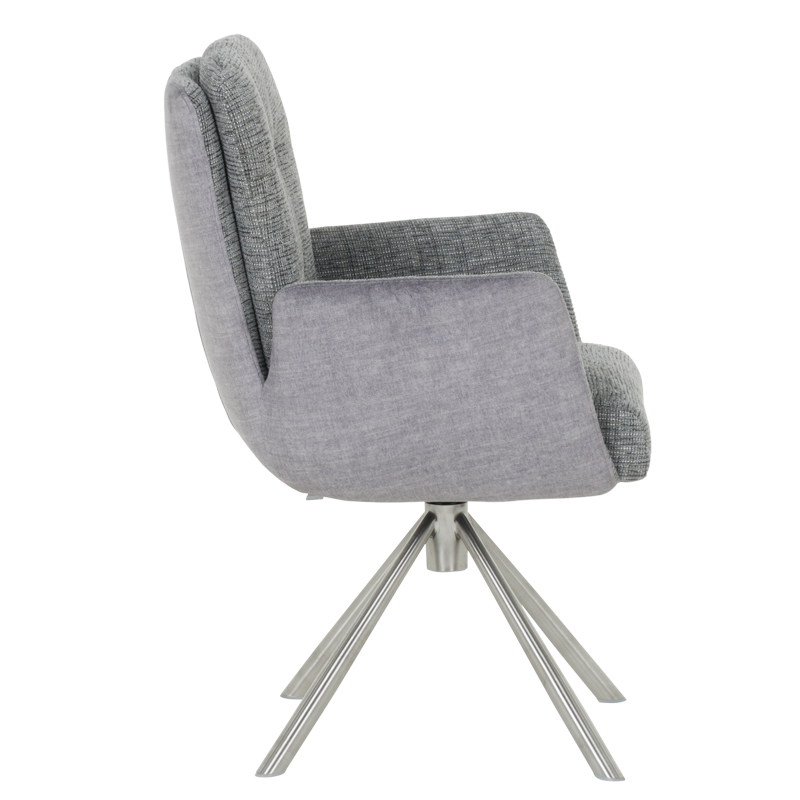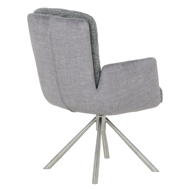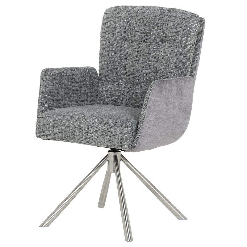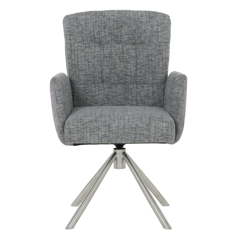Този елегантен стол съчетава модерен дизайн с изключителен комфорт, идеален за всяко съвременно пространство. Изработен с внимание към детайла, той предлага стабилност и дълготрайност благодарение на висококачествените материали, използвани в конструкцията му. Седалката и облегалката са облечени в мек текстил с изтънчен сив цвят, който придава усещане за уют и стил. Текстурата на плата добавя допълнителен визуален интерес и създава усещане за лукс.