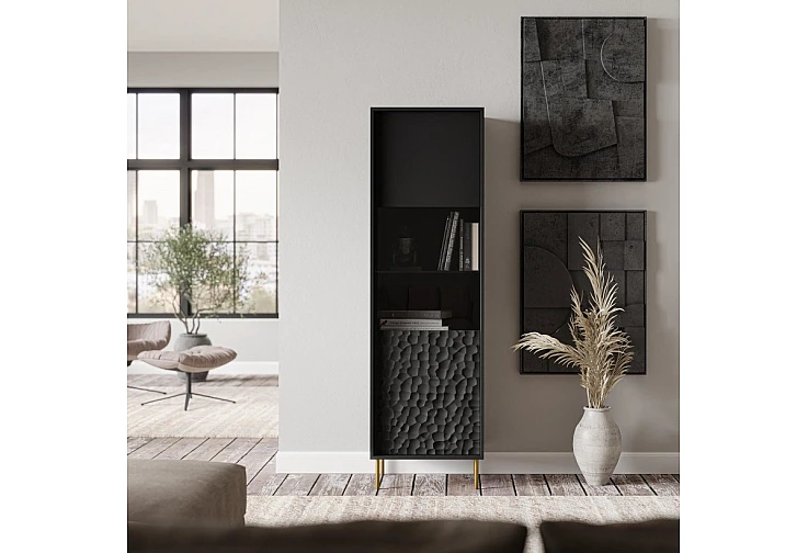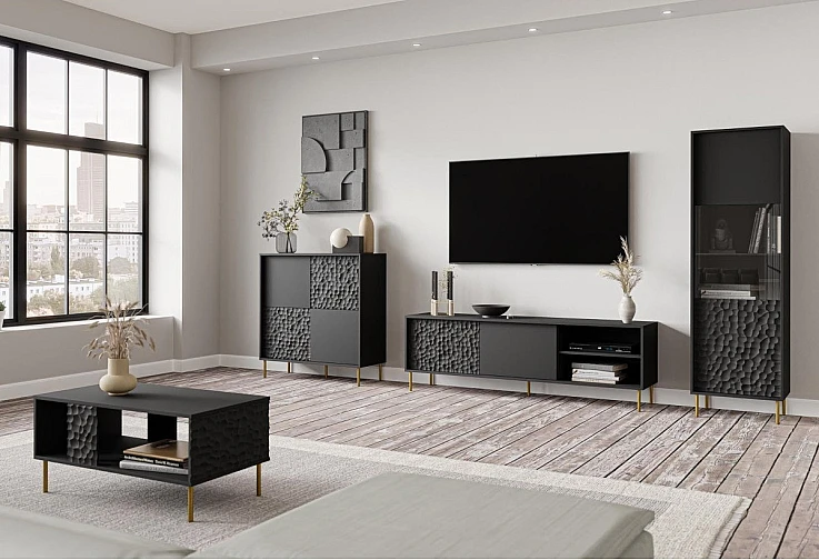 Мебелите са изработени от висококачествена мебелна плоскост в черен цвят с абстрактен 3D декор от МДФ на челата. Този изящен детайл придава художествен акцент и индивидуален чар на витрината.