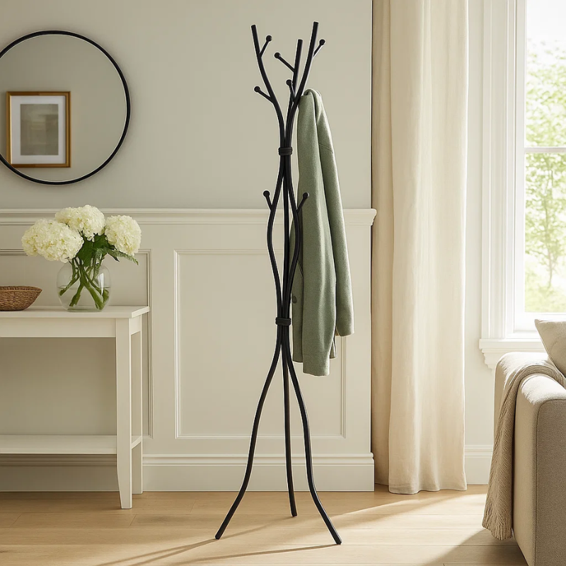 С осем умело проектирани връти, този предмет осигурява достатъчно място за висяне на дрехи, чанти или аксесоари. Умелото му оформление не само, че е практично, но и естетично, придавайки усещане за хармония и ред.