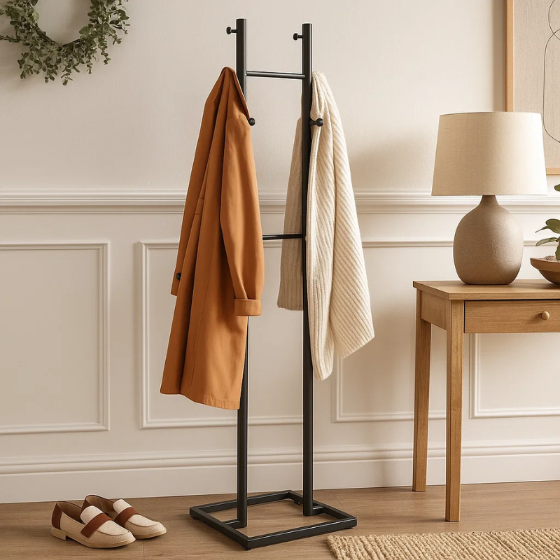 Елегантният стоящ аксесоар за съхранение на облекло съчетава стил и функционалност в изискан черен цвят. Той предлага съвременно решение за организиране на дрехи и аксесоари, което се вписва изключително добре в модерни интериорни пространства. Изработен от здрав метал, този продукт гарантира стабилност и дълготрайност, като същевременно добавя нотка на изисканост в дома или офиса ви.